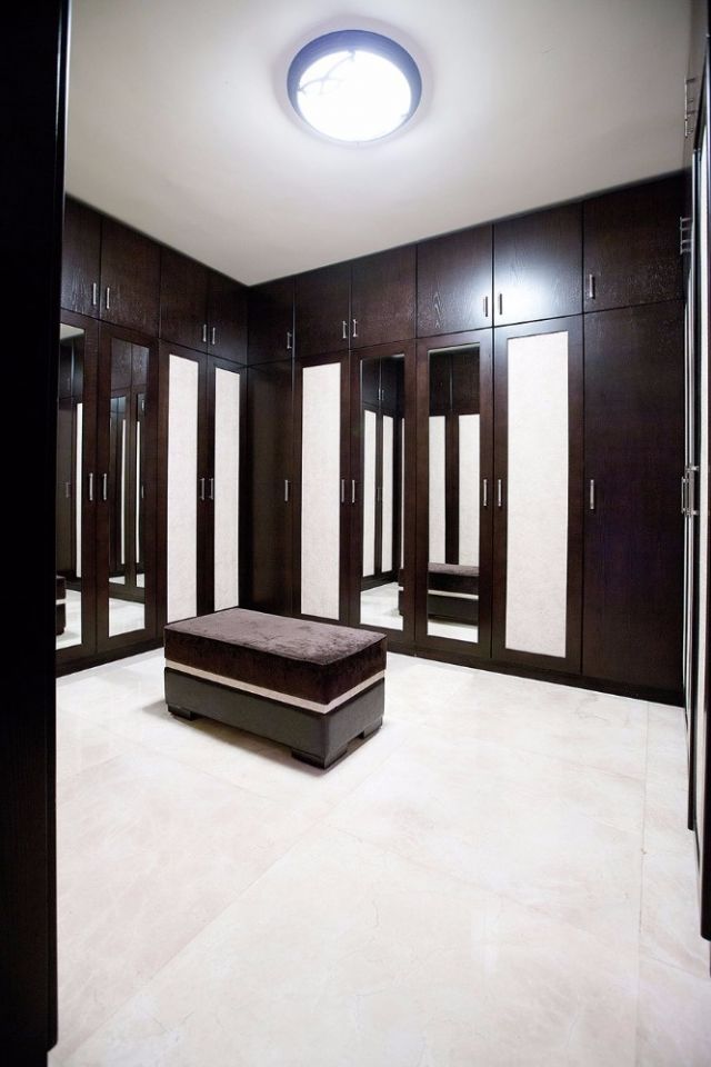 في غرفة النوم الرئيسة، يجثم سرير كبير بظهر منجّد، خلفه جدار بلون ذهبي مزركش ومطبّع بتقنيات رفيعة. وتضم هذه المساحة جلسة بطراز نيوكلاسيكي وتحتلّ الخزائن المطعّمة بالجلد هذا الركن، وهي خاصة بتوضيب الملابس.