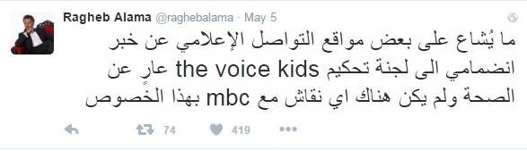 وغرّد السوبر ستار عبر صفحته الخاصة على "تويتر" قائلاً: " ما يُشاع على بعض مواقع التواصل الإعلامي عن خبر انضمامي الى لجنة تحكيم the voice kids عارٍ عن الصحة ولم يكن هناك اي نقاش مع mbc بهذا الخصوص".