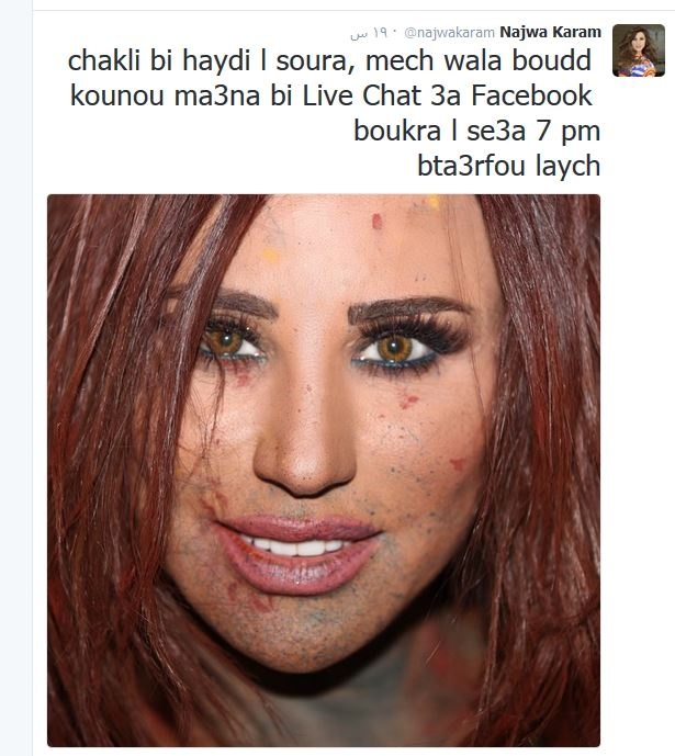 في سابقة من نوعها، نشرت النجمة اللبنانية نجوى كرم صورة غريبة عبر حسابها على "تويتر"، بدت فيها وجهها مطلياً بالألوان.