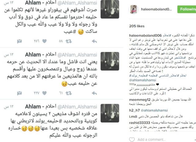 وغرّدت أحلام: "من فترة اشوف مذيعين يسيئون لاعلاميه كويتية وبالتحديد حليمة بولند ... لا تربطني بها علاقه شخصيه بس بعيدا عنه خساره الرجوله عيب والله عليكم".