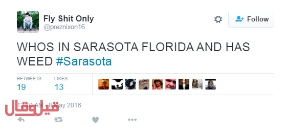 وغرّدت مستخدمة "تويتر" خلال مرورها في مدينة ساراسوتا في فلوريدا الأميركية: "من في المدينة ولديه بعض الماريجوانا؟".