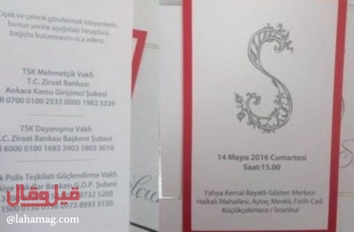 وبدأ توزيع الدعوات للزفاف على المدعوين، والذي تميز برسم حرف (S) كبير، الذي يمثل أول حرف من إسمي العريس، والعروس. كما أنه يوجد على الدعوة اسم والد ووالدة العريس "جانان – أوزدمير بيرقدار"، ووالد ووالدة العروس "أمينة- رجب طيب أردوغان".