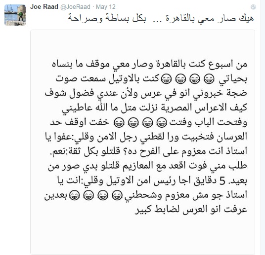 ونشر رعد عبر حسابه على موقع التواصل الإجتماعي "تويتر" صورة عبّر فيها عمّا حصل معه حين دخل خلسة إلى حفل زفاف من دون دعوة، بسبب فضوله لمشاهدة الأعراس المصرية.