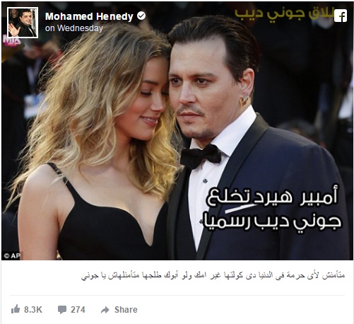 علّق الممثّل المصري محمد هنيدي على خبر تقدّم الممثّلة آمبر هيرد بدعوى طلاق من زوجها الممثّل والمنتج الأميركي العالمي جوني ديب بعد زواج دام 15 شهراً.