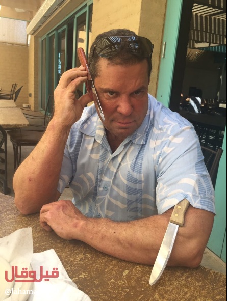 ظهر الأب وهو يحمل سكيناً كبيراً في يده ويضعه على ذراعة كما الوشم، ومن ثم على أذنه وكأنه هاتف، ونالت الصور إعجاب آلاف المشاهدين وتم تناقلها شكل واسع.