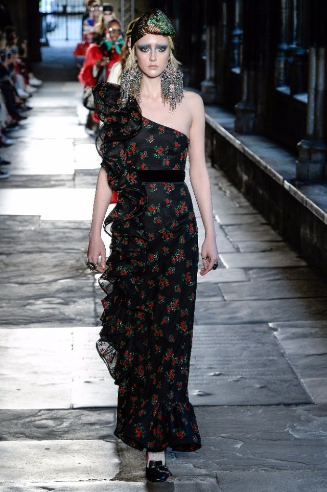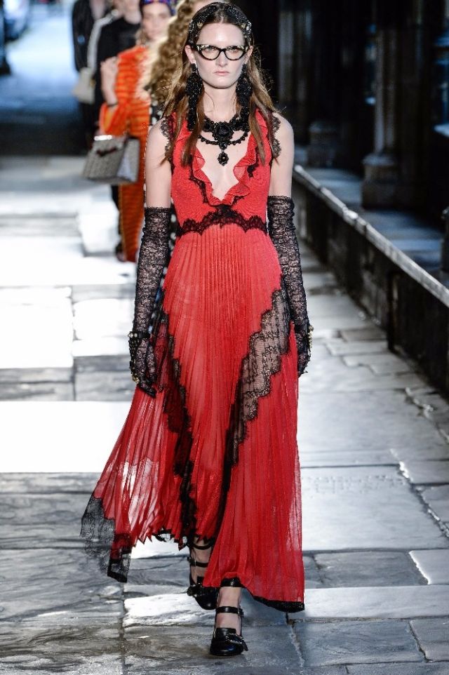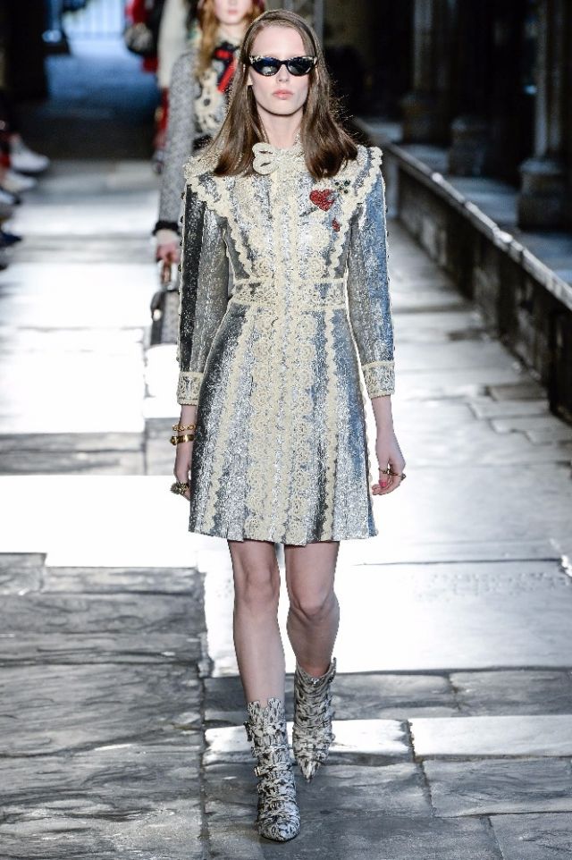 طابع فيكتوري عكسه المصمم أليساندرو ميشيل Alessandro Michele بالكشاكش عند الأكمام والياقات والدانتيل الفاخر، وآخر مشاكس متمرد وغامض تجلى بالخامات المطبعة بالمربعات والرسومات والنقوش الحيوانية. لنشهدها متفائلة ووردية بتصاميمٍ أخرى وألوانٍ كست أحذية البلاتفورم وأخرى مرحة بلعبة النظارات الشمسية المزدوجة.
