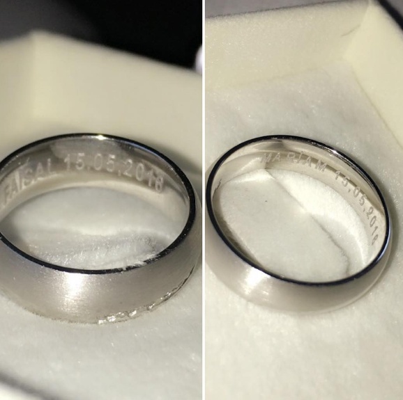 التي حفر عليها تاريخ "15-5-2016" وهو التاريخ الذي إرتبط فيه النجمان ببعضهما البعض رسمياً بعلاقةٍ عاطفية كانت سرية.