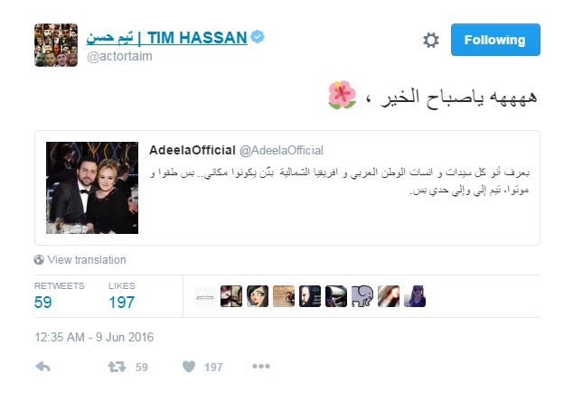 أعاد الممثّل السوري تيم حسن نشر صورة من صفحة "عديلة" عبر صفحته الخاصّة على "تويتر"، وقد ظهر تيم بالصّورة الى جانب الفنّانة العالميّة أديل.