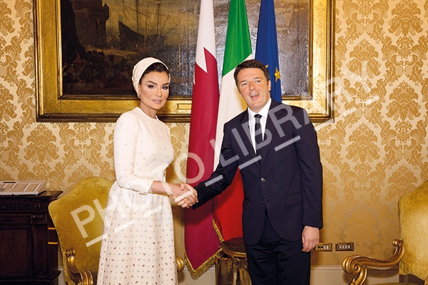 وخلال وجودها في العاصمة الإيطالية روما التقت الشيخة موزا، ماتيو رينزي رئيس وزراء إيطاليا، في قصر رئاسة الوزراء "كيجي". وتمت خلال اللقاء مناقشة عدد من الموضوعات المتعلقة بقضايا اللاجئين وسبل توفير التعليم النوعي في الظروف الصعبة وتعميمها على مستوى العالم.