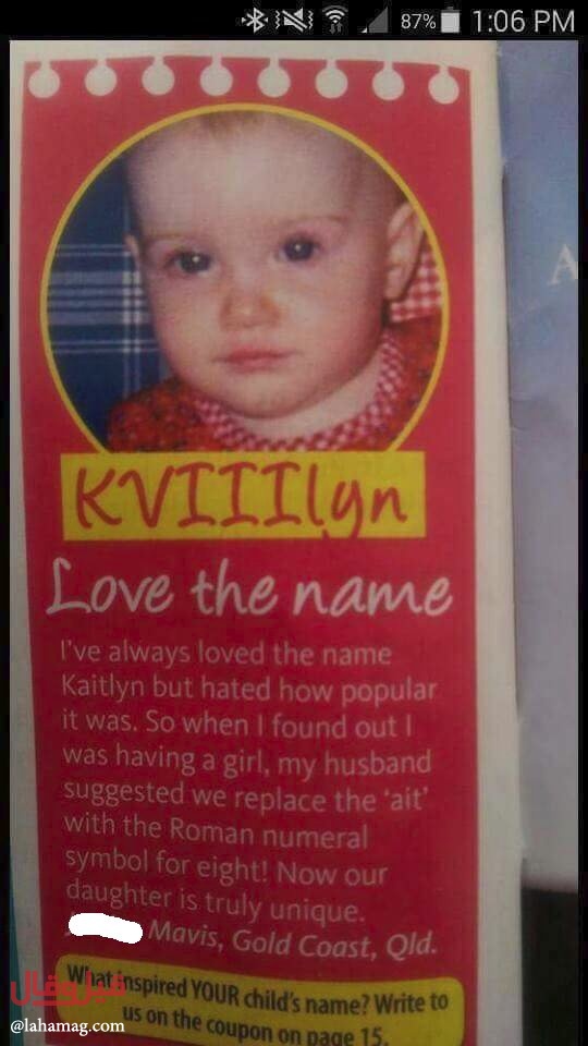 تسعى الامهات إلى اختيار أجمل اسم لموالدهن الجدد، إلا أن هذه الوالدة اختارت أغرب اسم واطلقته على طفلتها وهو KVIIIlyn.