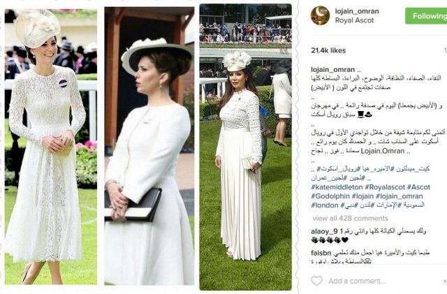ارتدت لجين ملابس شبيهة بما ارتدته دوقة كامبريدج كيت ميدلتون والأميرة هيا، حيث ارتدت السيدات الثلاثة فساتين بيضاء مع دانتال وقبعات على رأسهن.