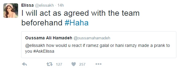 أطلقت الفنّانة اللبنانية اليسا حملة "اسأل اليسا"، أمس، عبر صفحتها الرسميّة على "تويتر"، ومن بين الأسئلة التي جاوبت عنها: "كيف تتصرّفين في حال حللت ضيفة على برامج المقالب مع رامز جلال أو هاني رامز".