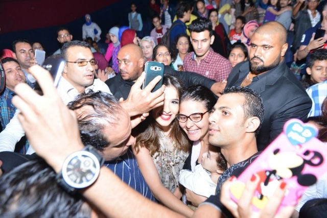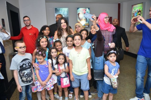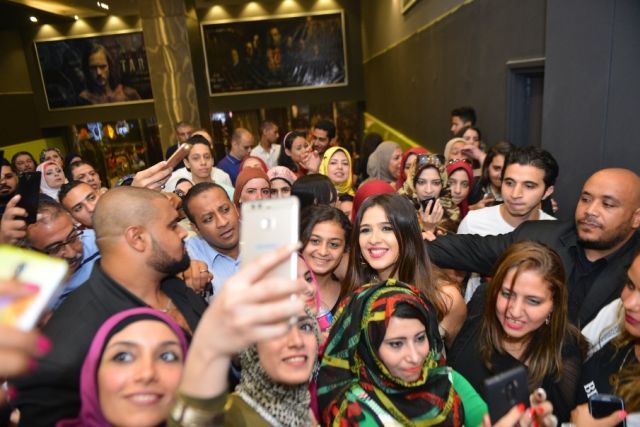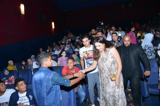 والتف الجهور حولها ،وطلبوا منها إلتقا مجموعة من الصور معها، وهو ما إستجابت له ياسمين ، وكان بصحبتها منتج الفيلم أحمد السبكي ونجله محمد.