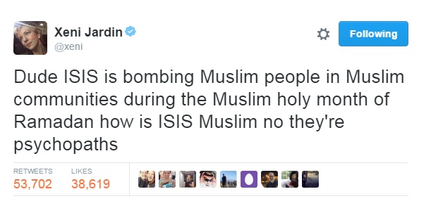تشارك السيدة Xeni Jardin يومياً أفكارها العشوائية عبر صفحتها الخاصّة على "تويتر"، إلّا أنّها لم تكن على علمٍ بأنّ تغريدتها عن داعش والإسلام ستجتاح العالم.