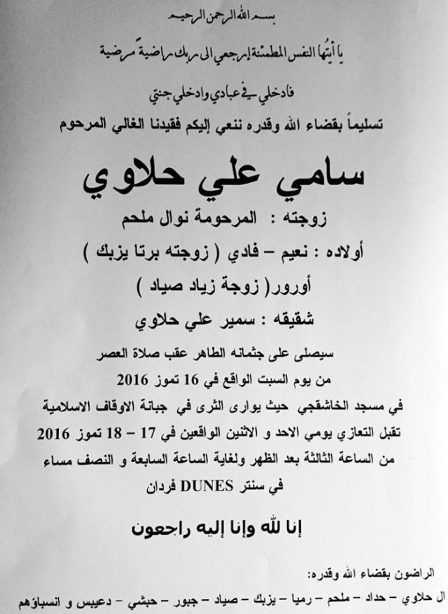وسيقام العزاء يومي الأحد والأثنين المقبلين من الساعة الثالثة بعد الظهر الى الساعة السابعة والنصف مساءً في سنتر Dunes في فردان.