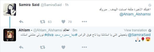 وكتبت سميرة رسالة لأحلام عبر تويتر قالت فيها:" أغنيتك الأخيرة طلقة أصابت الهدف.. مبروك ".