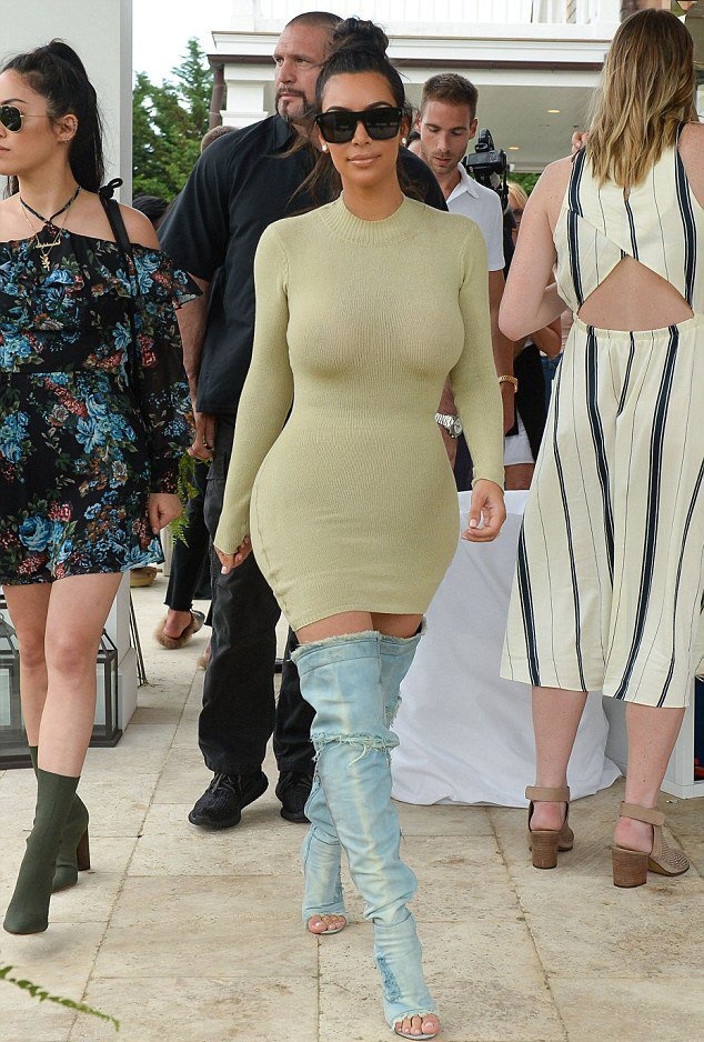 وظهرت كارداشيان في الحفل، مرتديةً فستاناً قصيراً، مع حذاء وصل الى ركبتيها، كما رفعت شعرها على شكل كعكة.
