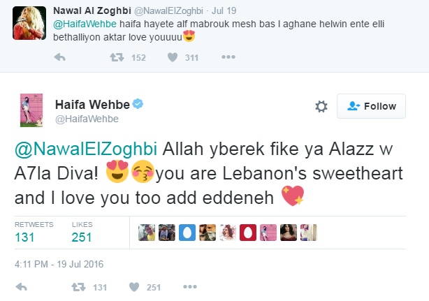 وبدورها، شكرت وهبي نوال على تغريدتها وردّت عليها: "الله يبارك فيكي يا ألذ وأحلى ديفا ... أنت حبيبة قلب لبنان وأنا بحبك كمان قد الدتي".