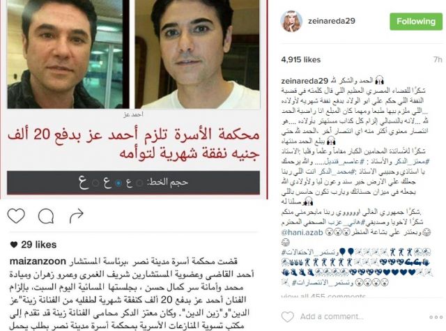 ألزمت محكمة مصرية الفنّان أحمد عزّ بدفع 20 ألف جنيهاً كنفقة شهرية لطفليه التوأم من الفنانة زينة التي نشرت خبر الحكم مع صور خصمها عبر حساباتها على شبكات التواصل الإجتماعي، معلقةً: "بعتذر على بشاعة المنظر".