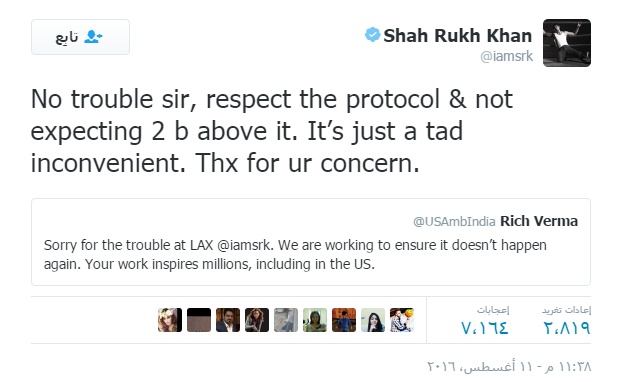 وغرّد ريتشارد فيرما سفير الولايات المتحدة الأميركية في نيودلهي، معتذراً من "شاروخان".