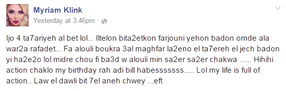 وكتبت كلينك في تدوينة عبر حسابها على موقع التواصل الإجتماعي "فيسبوك":جاء 4 تحريّين إلى منزلي، ورفضت أن اوقع على ورقة قدموها لي، فأعلموني بأنه عليّ التوجّه للتحقيق معي في مخفر الجديدة لأن تحري الجيش يريدون التحقيق معي".