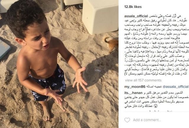 نشرت صورة علي على البحر وكشفت قائلة: "هي أوَّل قصّه وهيّي بتخص علّوشه... هاد كان لعلّوشي رفيق بحبّه كتير وإجى عيد ميلاد رفيقه والحقيقه علّوشه صاحب واجب وصاحب صاحبه وبيحب يعبّر عن مشاعره فعليّاً فراح وجاب لوحه بيضا ورسم عليها رسمه رائعه (علّوشه رسّام)، المهم هاللوحه أخدت من وقت دراسته ومن وقت عيلته وخصوصاً إنّه قعد بعيد ويزيد فيها، وطلب مننا نروح كلنا معه الحفله لنشارك رفيقه الإحتفال، رفيقه لعلّوشه تفشخر باللوحه لأنّها لوحة رسّام مهمّ، وما اهتمّ فيه ولا فينا حتّى، وعصّب كتير علي وأخد قرار إنّه ما يعمل لوحات إلّا لمعارضه أو لمن يستحقّها (وهاد علي بالصوره بأوّل ردّ فعل إجاله من إهمال رفيقه لمجهوده ومشاركته إله عيده، وكمان كان زعلان علينا ومُحرج قدّامنا)، وطبعاً كوني أمّه زعلت لزعله ( قصّه لولبيّه ممكن تنفهم وممكن لأ).