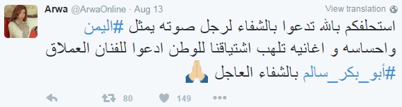 وجّهت الفنانة اليمنية أروى دعاءًا لزميلها وابن بلدها ابو بكر سالم، وغرّدت عبر حسابها الرسمي على "تويتر": "استحلفكم بالله أن تدعوا بالشفاء العاجل لرجل صوته يمثل اليمن، وإحساسه وأغانيه تلهب اشتياقنا للوطن".