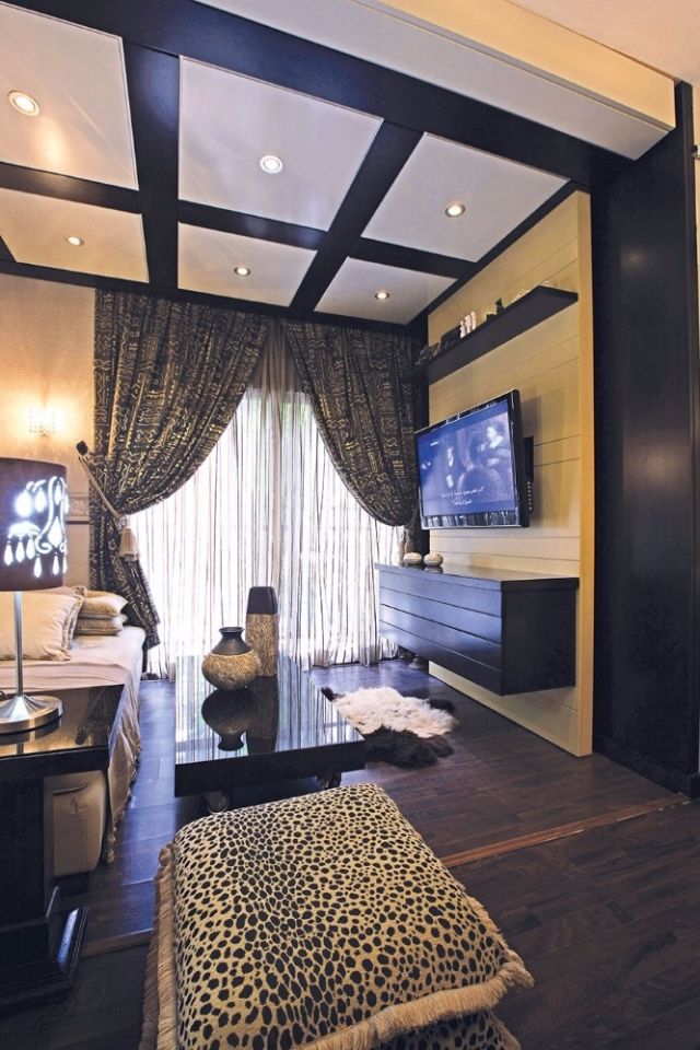 أما قطع السجاد فقد اختارتها المهندسة من الطراز العصري الذي يزاوج بين الجلد الفاخر والقطن الناعم... وعكست الجدران ألوان «الموكا» بطريقة فنية محترفة... وتميّز السقف بأعمال الجص التي تداخلت فيها خطوط متفاوتة الطول.