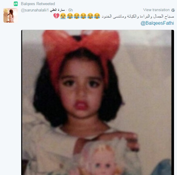 نشرت احدى معجبات الفنّانة اليمنيّة بلقيس، عبر حسابها على "تويتر"، صورة من طفولة الفنّانة الجميلة، وعلّقت: "صباح الجمال والبراءة والكياتة وما ننسى الخدود!!".