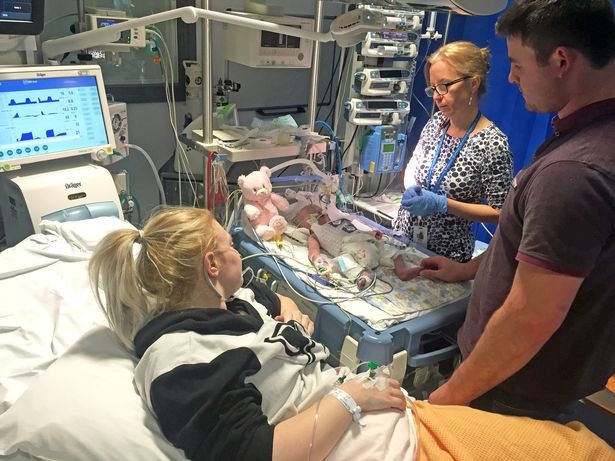 وبعد معاينتها بشكل سريع، قرر الأطباء إجراء عملية قيصريّة لها، فظلت الأم مستيقظة طيلة الوقت نتيجة الخوف، ولكن نبضات قلب الطفلة كانت معدومة لحظة الولادة، وبعد محاولات يائسة لإنعاشها استمرت لأكثر من 8 دقائق عادت الطفلة ايفيلي إلى الحياة بصحّة جيدة.