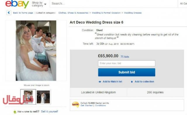 ووضعت الإنكليزية سمانتا راغ إعلاناً عبر موق ebay من أجل بيع فستان زفافها، موضحة أنها بحالة جيدة جداً، إلّأ انه بحاجة للتنظيف من بقع الخيانة.