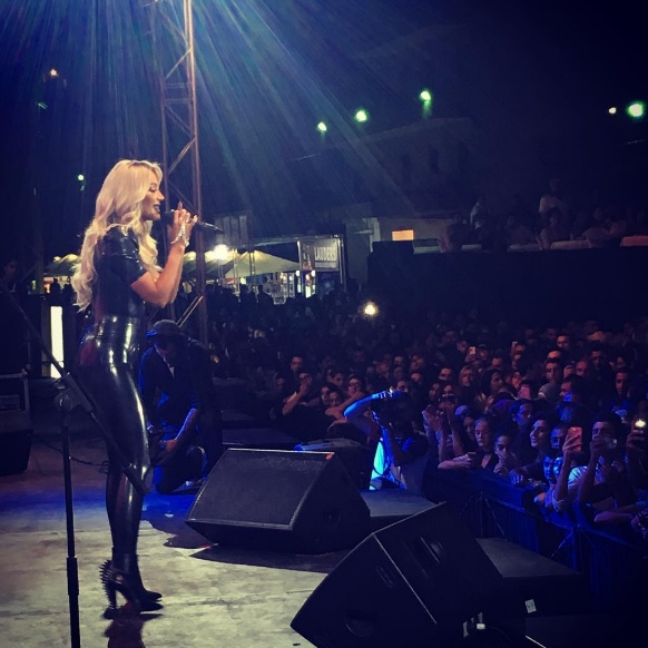وصعدت الفنّانة اللبنانية على المسرح بإطلالة ساحرة بـJumpsuit من الـ Latex الأسود، قبل أن تشعل الأجواء بباقة من أغانيها القديمة والجديدة، وعلى رأسها "سبع ترواح".