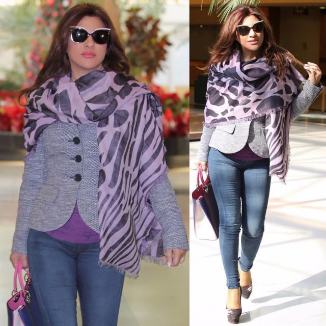 اعتمدت الفنانة نجوى كرم في تنسيقها للفولار باختياره بطبعات ألوان إطلالاتها كالوشاح بتدرجات اللون الموف التي نسقته مع سترة وتوب بالألوان نفسها.