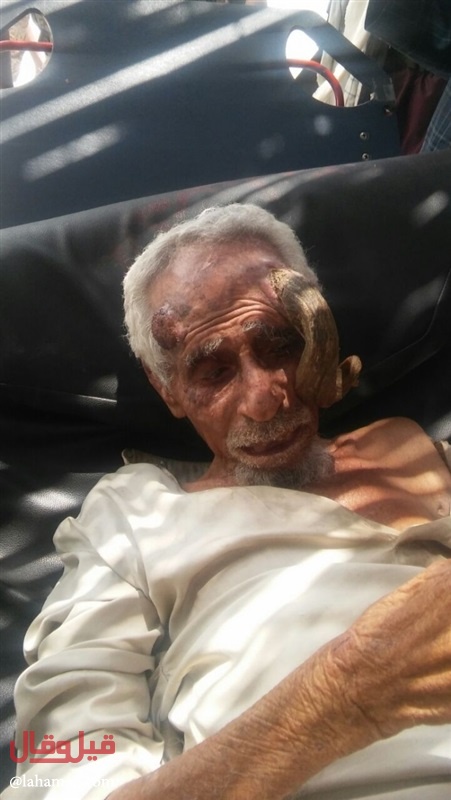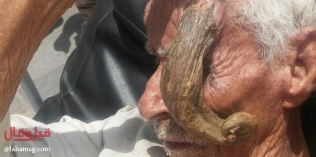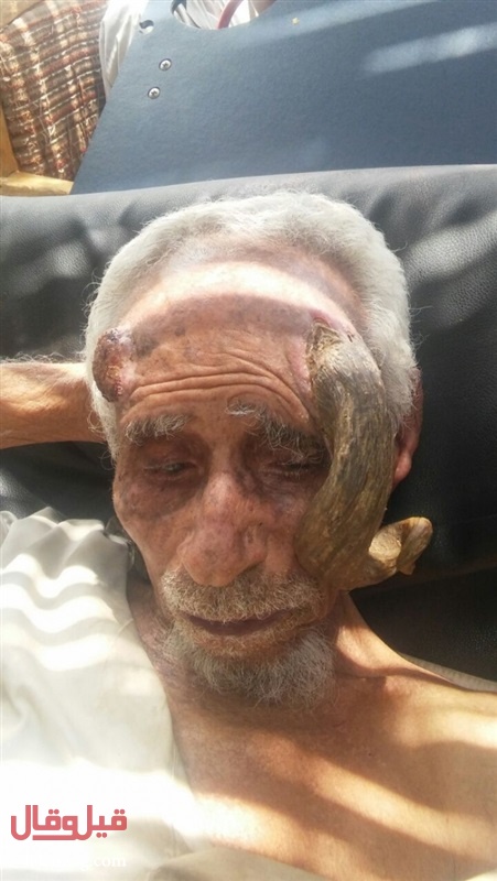 وأظهرت الصور رجلاً سبيعينياً من محافظة الجوف اليمنية، بقرن يتدلى من جبينه من الجهة اليسرى.