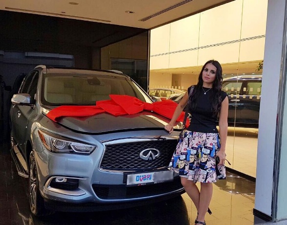 وشاركت الحريري صورتها إلى جانب السيارة الفخمة في إمارة دبي من نوع "انفنيتي"، والتي تلقتها هدية من الفنّان السوري بمناسبة يوم ميلادها.