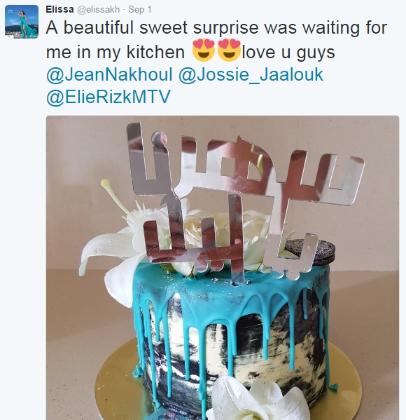 ونشرت اليسا صورة القالب على حسابها الرسمي على "تويتر" وكتبت: "مفاجأة جميلة كانت بانتظاري في المطبخ، أحبكم".