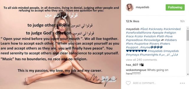 بدورها، ردّت دياب على منتقديها، ونشرت صورة عبر حسابها الرسمي على "انستغرام" وكتبت: "قولوا لي انتو مين لتحكموا على الأخرين، قولوا لي إنتو مين لتحكموا على خلق الله".