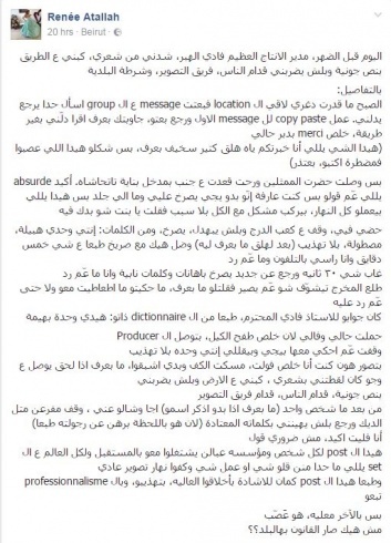كشفت الممثلة ومنسقة الملابس اللبنانية رينيه عطالله، عبر حسابها الخاص على موقع "فيسبوك" يوم أمس، عن تعرّضها للضرب المبرح والإهانة في احد مواقع التصوير على يد مدير الإنتاج فادي الهبر.