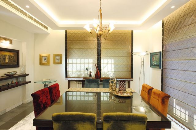 ونأتي إلى غرفة الطعام التي تولّت المصممة تنجيدها بألوان تجمع فيها مواسم السنة! وتوزعت الكراسي الملونة والمنجدة حديثاً بقماش من الحرير حول الطاولة المربعة لتتشارك كل كرسيّين منها الأحمر والأصفر والأزرق والأخضر.