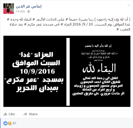 ثم نشرت توقيت ومكان العزاء وكتبت: "ان لله وإن إليه راجعون.. ربنا يصبرنا جميعاً على الحادث الأليم. البقاء لله وحده غدا الموافق يوم السبت 10/9/2016 العزاء في مسجد عمر مكرم بعد صلاة المغرب".