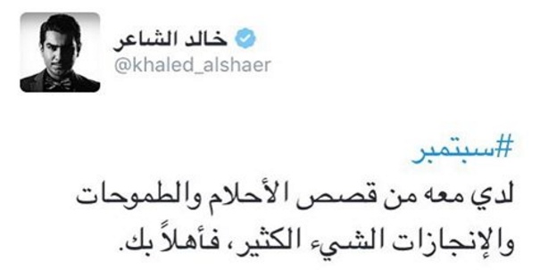 وكتب خالد: "سبتمبر.. لدي معه من قصص الأحلام والطموحات والإنجازات الشيء الكثير، فأهلاً بك".