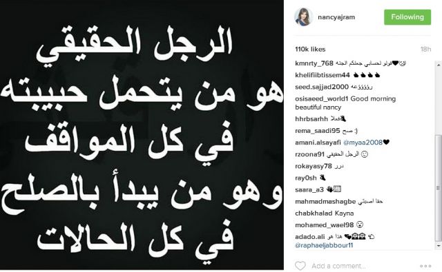نشرت الفنانة اللبنانية نانسي عجرم، عبر حسابها الرسمي على تطبيق "انستغرام"، صورة سوداء كُتب عليه: "الرجل الحقيقي هو من يتحمل حبيبته في كل المواقف وهو من يبدأ بالصلح في كل الحلات".