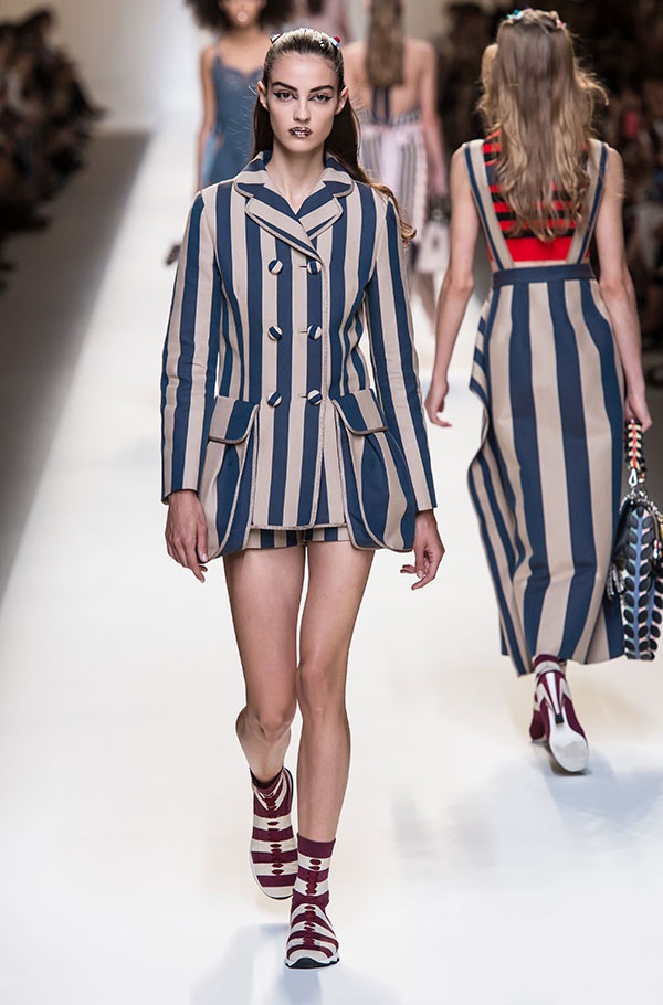 تميزت إطلالات عرض Fendi بالتقليمات الملونة والمتعددة فمنها ما ظهر أفقياً ومنها عامودياً ومنها مادمجت مع بعضها البعض.