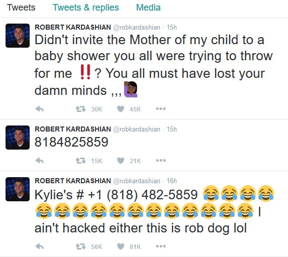وأتبع تغريدته بأخرى قال فيها: "لن تقومي بدعوة والدة إبني (بلاك شاينا) إلى حفلة الـ Baby Shower الذي ستقيمينها لي؟ يبدو أنّكم فقدتم عقلكم"، ويأتي ذلك على خلفية عدم دعوة شاينا إلى أحدث حفلات روب.