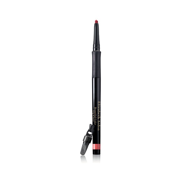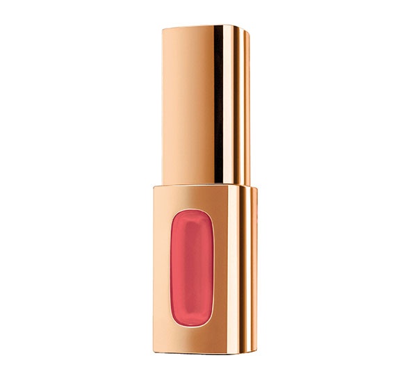 حدّدي شفتيك بقلم وردي طبيعي Elizabeth Arden Beautiful Color Lip Liner in Naturel، وغلّفيهما بأحمر شفاه سائل لمّاع ورديّ اللون L’Oreal Paris Colour Riche Extraordinaire Liquid Lipstick in Rose Melody no.101.