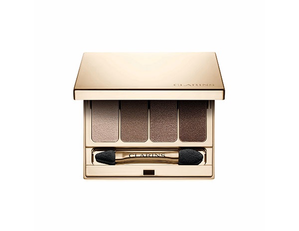 ● لتجميل عينيك، استعملي علبة ظلال الجفون الرباعية الألوان Clarins 4 Colour Eyeshadow Palette in Brown no.03، وزّعي الظل العاجي فوق كامل الجفن الأعلى، والظل البني-الرمادي فوق الجفن المتحرّك. بعدها، ضعي لمسة من الظل البني المتوسط عند طيّة العين، والداكن عند زاوية العين الخارجية ثم موّهي اللون نحو الداخل. استعيني أيضًا بالظل البني الداكن لتحديد جذور الرموش السفلية. لإشراق النظرة، ضعي لمسة من الظل الذهبي البرّاقBourjois Nude Remix Little Round Pot in Extra-Or-dinaire no.12 عند زاوية العين الداخلية وخط الرموش السفلية.