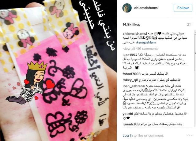 من جهتها، علّقت أحلام على الصورة، وكتبت: "حبيبتي بنتي فاطمة.. هدية منها لي.. هي عملتها بيديها شوفوا الهديه على سنابي."