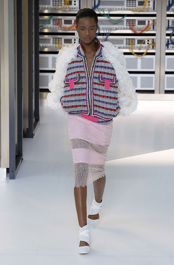 فظهرت الكابلات الملونة والألياف الضوئية وشبكات التواصل وانطلق العرض بإطلالات مستقبلية بحيث ارتدت العارضتان خوذة على شكل الرأس الآلي. ولكن لم تخطف هذه الأجواء في عرض ربيع وصيف 2017 الباريسي مهارات امرأة شانيل الاجتماعية ولا شغفها في الحياة.
