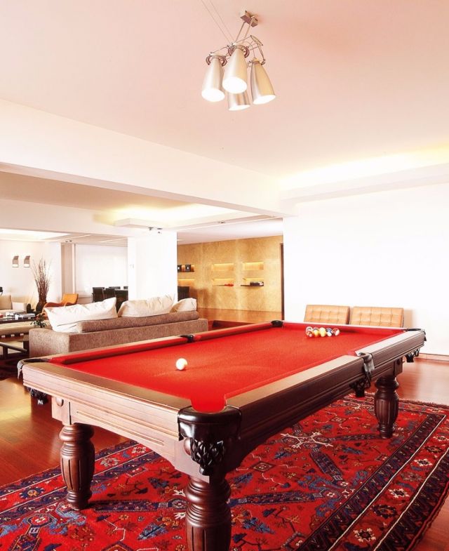 وبما أنّ المنزل مصمّم لراحة سكانه بأسلوب عملي وجميل في آن معاً، خصصت المهندسة ركناً في قاعة الاستقبال خلف جلسة المدفأة مطلّاً على الشرفة لطاولة البلياردو حيث يمضي المالكون أوقات التسلية والترفيه.