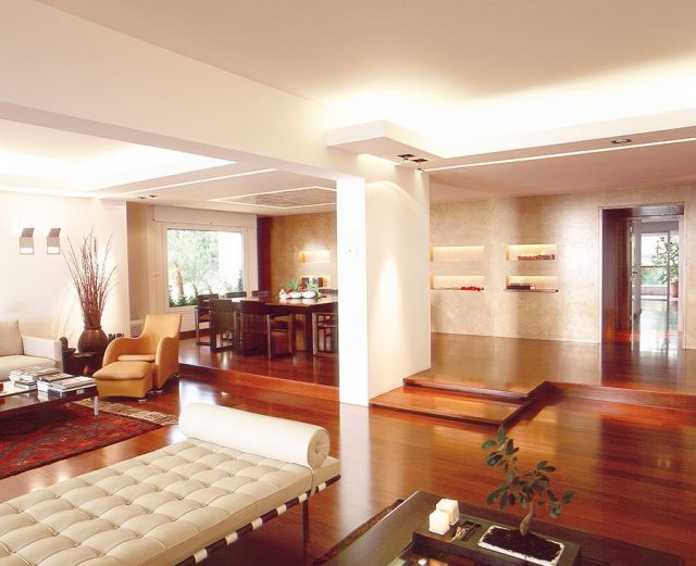 ولعلّ التميّز في هذا المسكن يكمن في كثرة استعمال الخشب المنعكس جمالاً ودفئاً وراحة. الأرض في المنزل كله من الباركيه بلونه الكرزي الذي أضفى حياةً وإشعاعاً على الصالونات. والأرض الباركيه مستويان، أعلى وأدنى.
